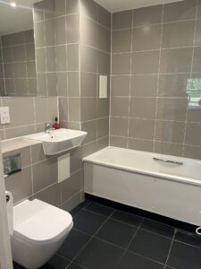 Stylish family bathroom with a modern white suite, part-tiled walls, and a bath with shower and screen
