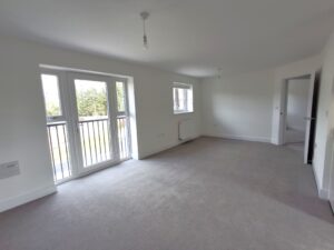 Good size living room with Juliette balcony (to first floor only) and white Venetian blinds to the front facing windows.